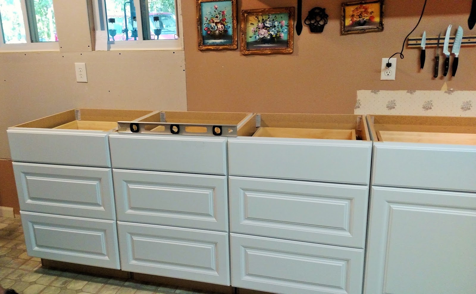 We decided to put the cabinet doors on each end and line the drawer units up in the middle..they were leveled and attached to the walls....